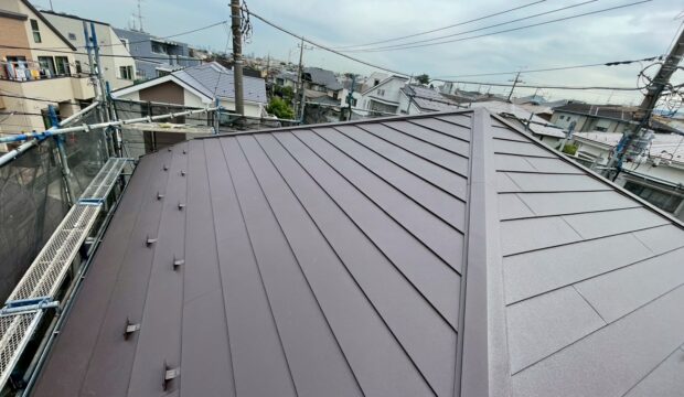 仕上がりはいかがでしょうか?ブラウンで統一され、意匠性の高いオシャレな屋根に生まれ変わりました!デザインだけではなく、機能性にもこだわった施工ですので、長期にわたって安心して暮らしていただけます♪