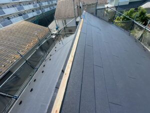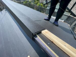 最後に、新しい屋根材と棟板金(雨水の侵入を防ぐため屋根の頂上部に設置する金属板)を取り付けて完工です。