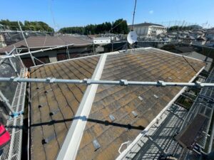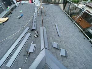ルーフィングの上から新しい屋根材と棟板金(雨水の侵入を防ぐため屋根の頂上部に設置する金属板)や換気棟を取り付けて完工です。