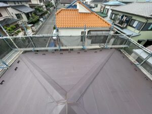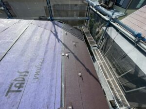 ルーフィングの上から新しい屋根材と貫板・棟板金(雨水の侵入を防ぐため屋根の頂上部に設置する金属板)や換気棟を取り付けて完工です。
