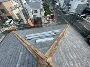 まず、屋根の頂点に取り付けられた棟板金と貫板を撤去します。
