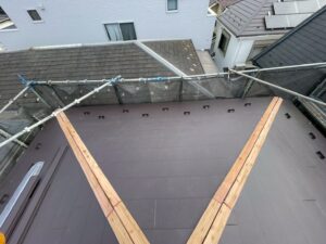 最後に、貫板・棟板金と新しい屋根材(スーパーガルテクト)を取り付けます。