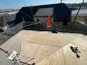 右の写真の木製の板は野地板(のじいた)というもので、屋根材を支えるための下地板です。