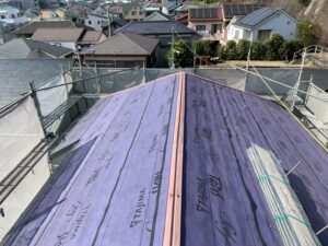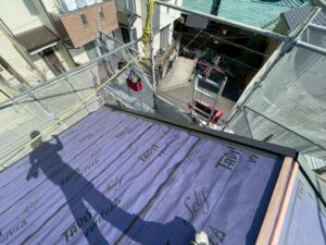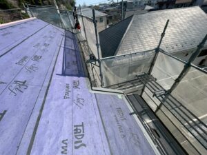 ルーフィング(防水シート)の敷設を行います。