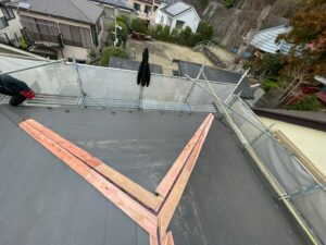 棟に沿って走っている木材が貫板といい、屋根を最前線で守る棟板金の固定土台です。
