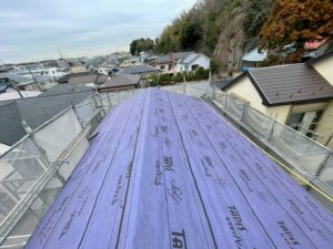 ルーフィング(防水シート)の敷設を行います。