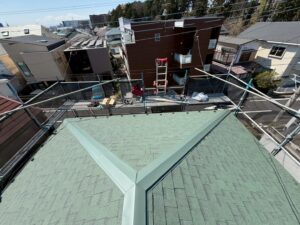 軒先や角、板金取り付け部との取り合いなどしっかりと重ねて納めました。